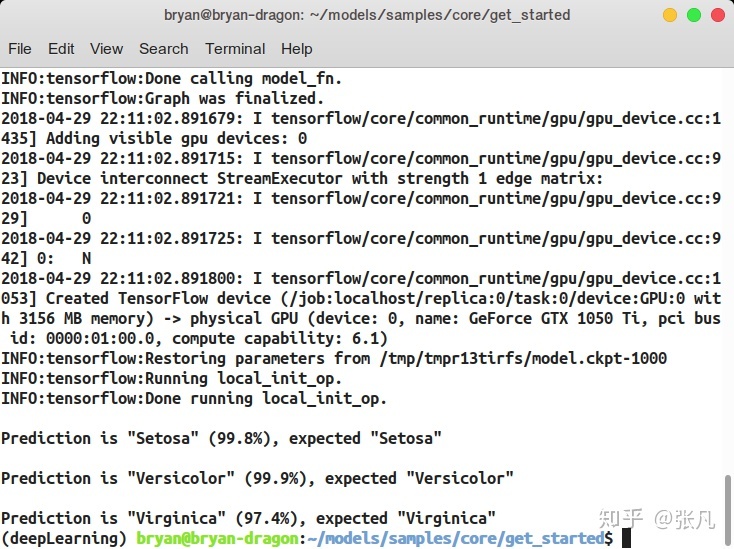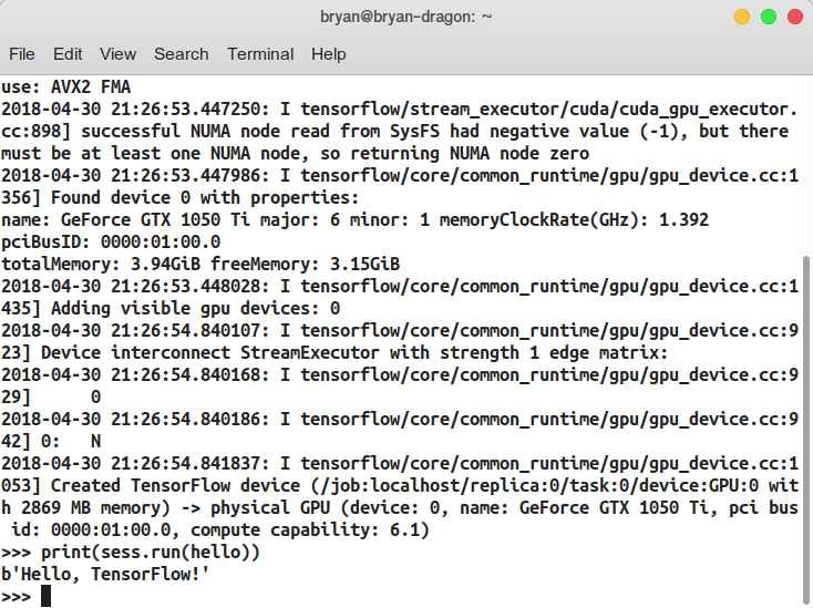 import tensorflow as tf hello = tf.constant(âHello, TensorFlow!â) sess = tf.Session() print(sess.run(hello)) {% endhighlight %} The result is the same. But we can see our GPU device is working. In my case, you can see GTX 1050 Ti in the test result below.